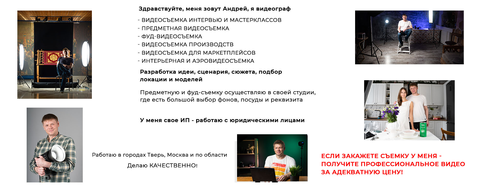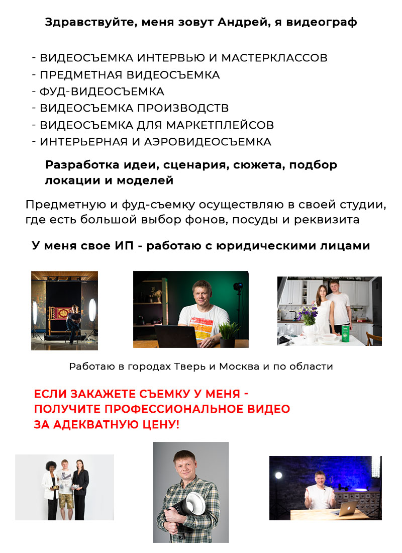 Профессиональное оборудование и свет. Полный цикл: сценарий, съёмка, монтаж, цветокоррекция. Опыт работы с брендами, ресторанами, онлайн-школами и маркетплейсами. Индивидуальный подход к каждому проекту. Свяжитесь со мной, чтобы обсудить идею и воплотить её в живое, продающее видео.